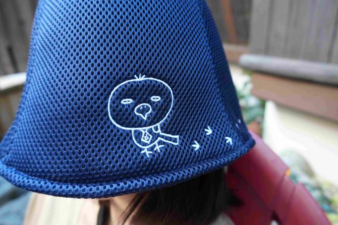 右横側には、いんこが楽しそうにお散歩しているような「足跡」の刺繍をあしらいました。さらに後ろ側には、小さく、ひっそりと佇む「かくれいんこ」が。